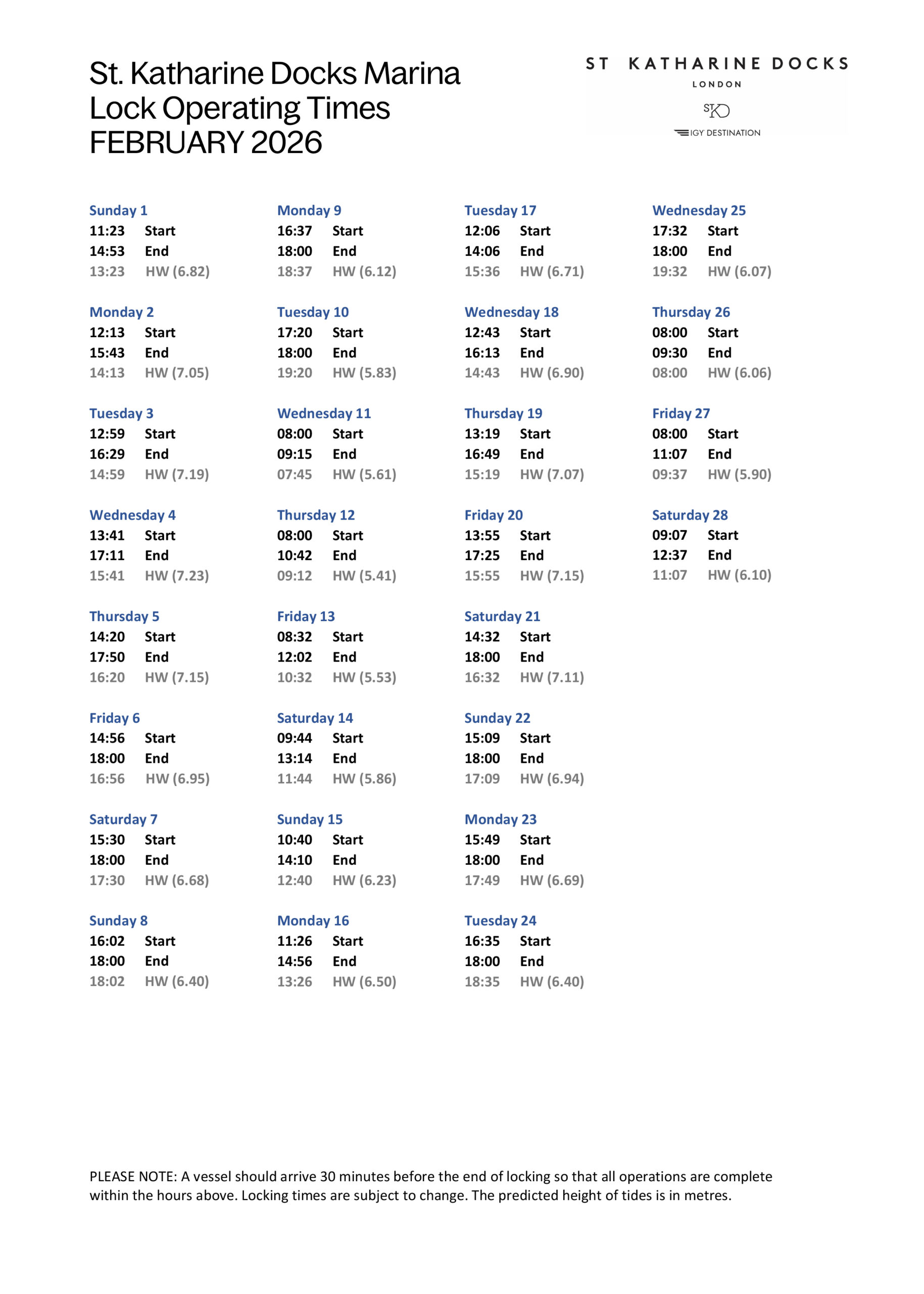 SKD Marina Locking Times February 2026(PDF, 0.51MB)