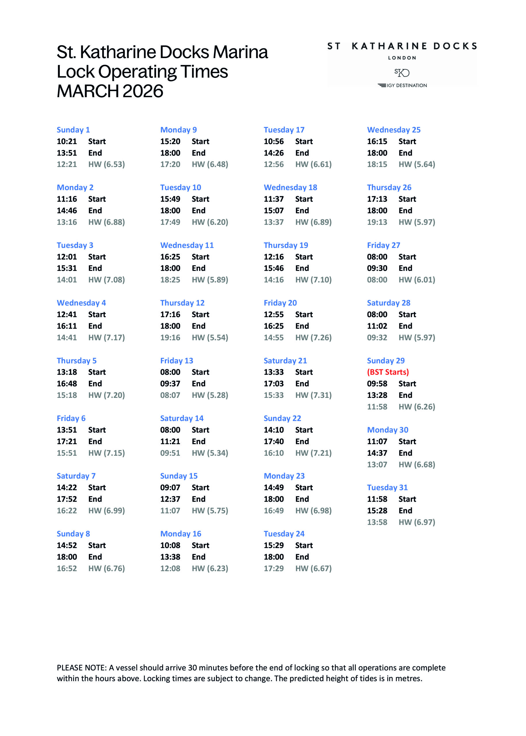 SKD Marina Locking Times March 2026(PDF, 0.49MB)