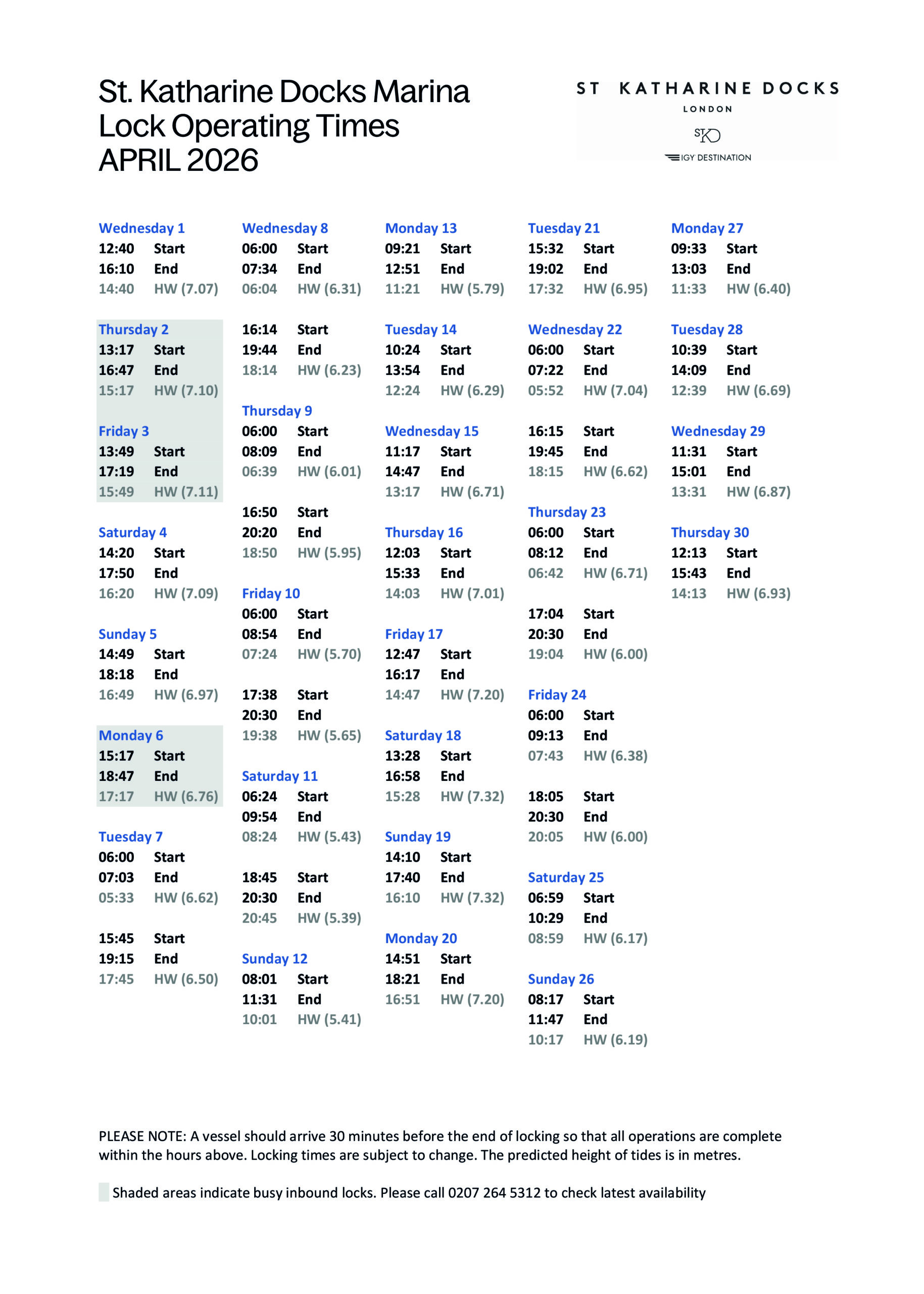 SKD Marina Locking Times April 2026(PDF, 0.5MB)