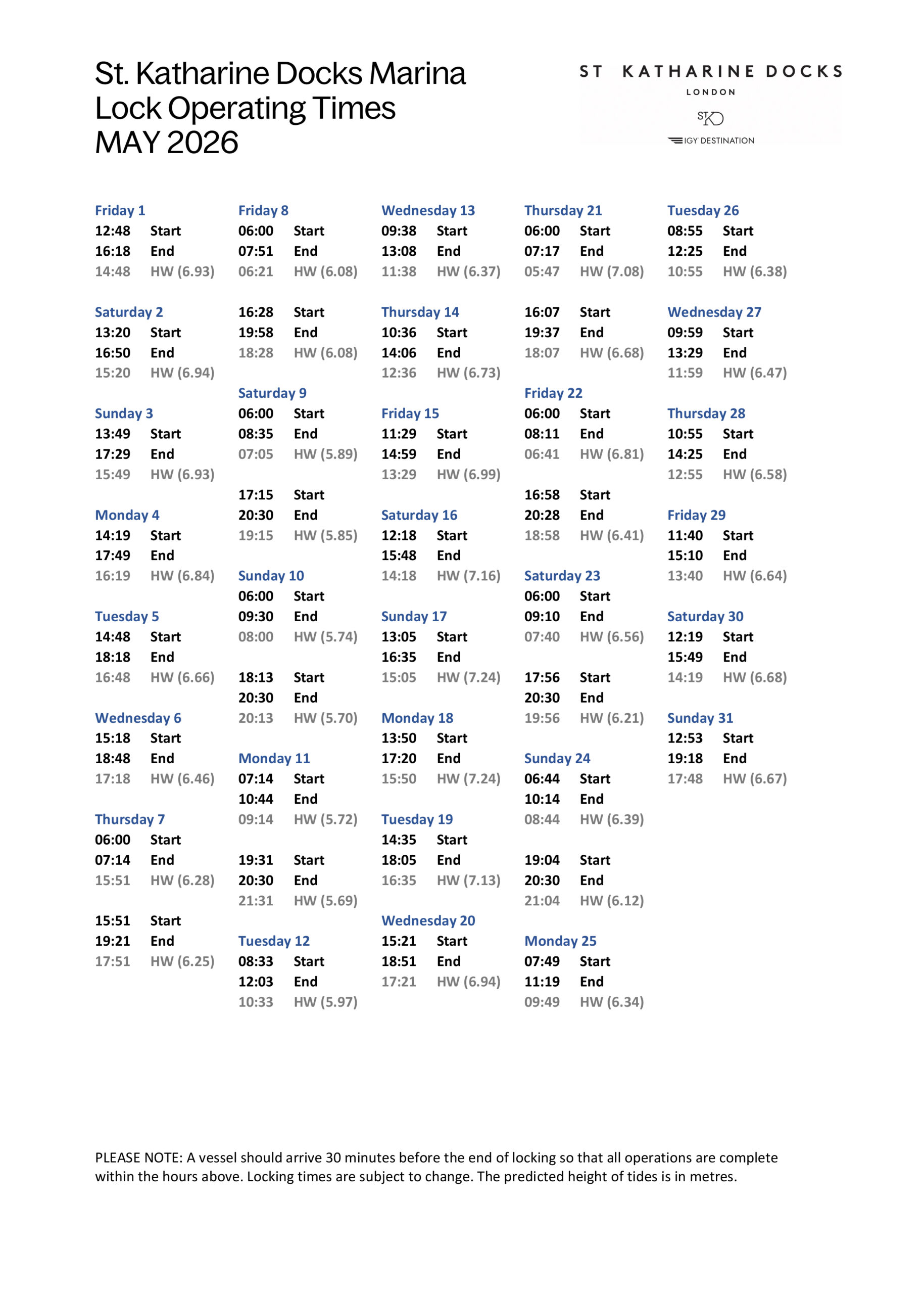 SKD Marina Locking Times May 2026(PDF, 0.51MB)