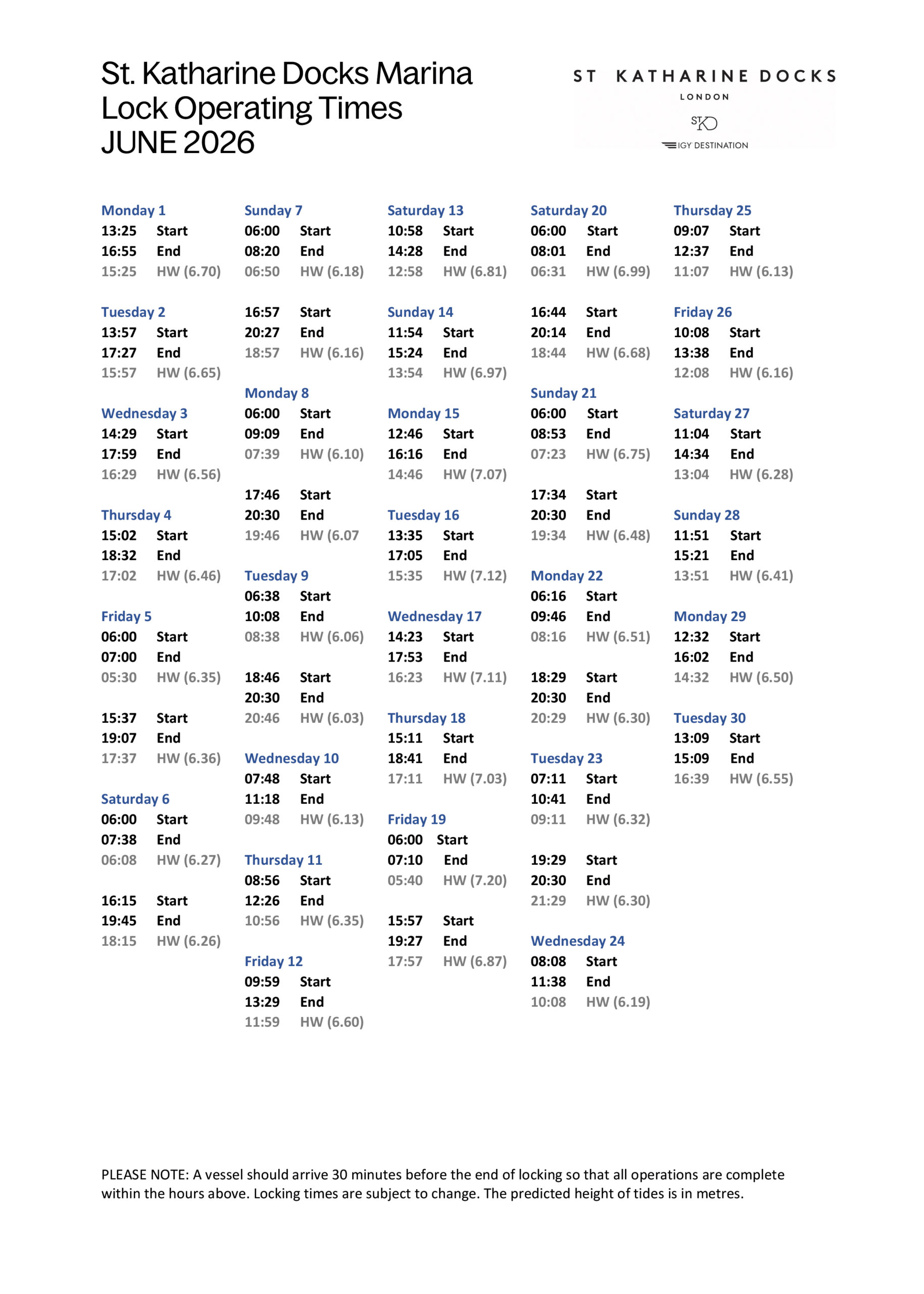 SKD Marina Locking Times June 2026(PDF, 0.51MB)