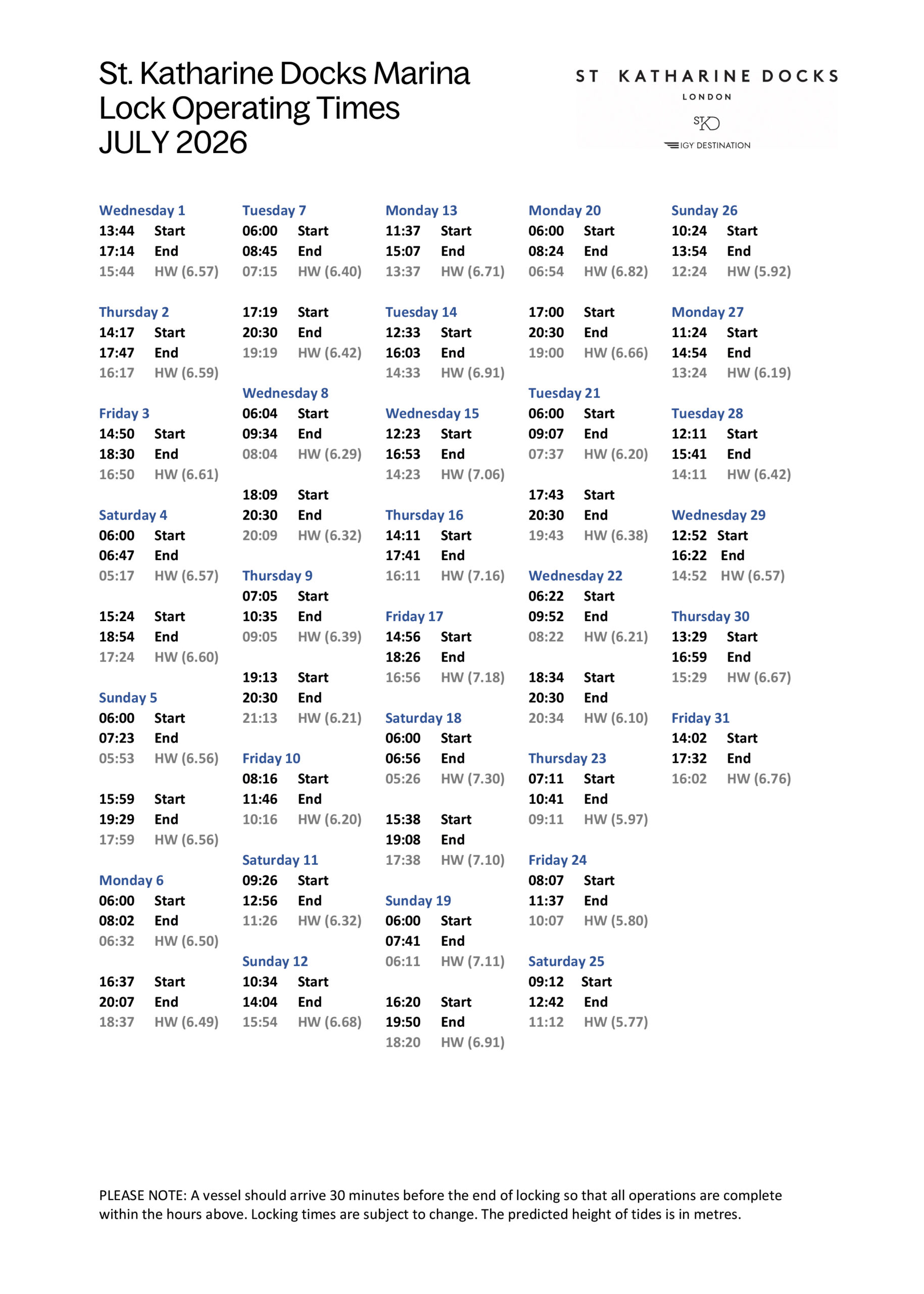 SKD Marina Locking Times July 2026(PDF, 0.51MB)