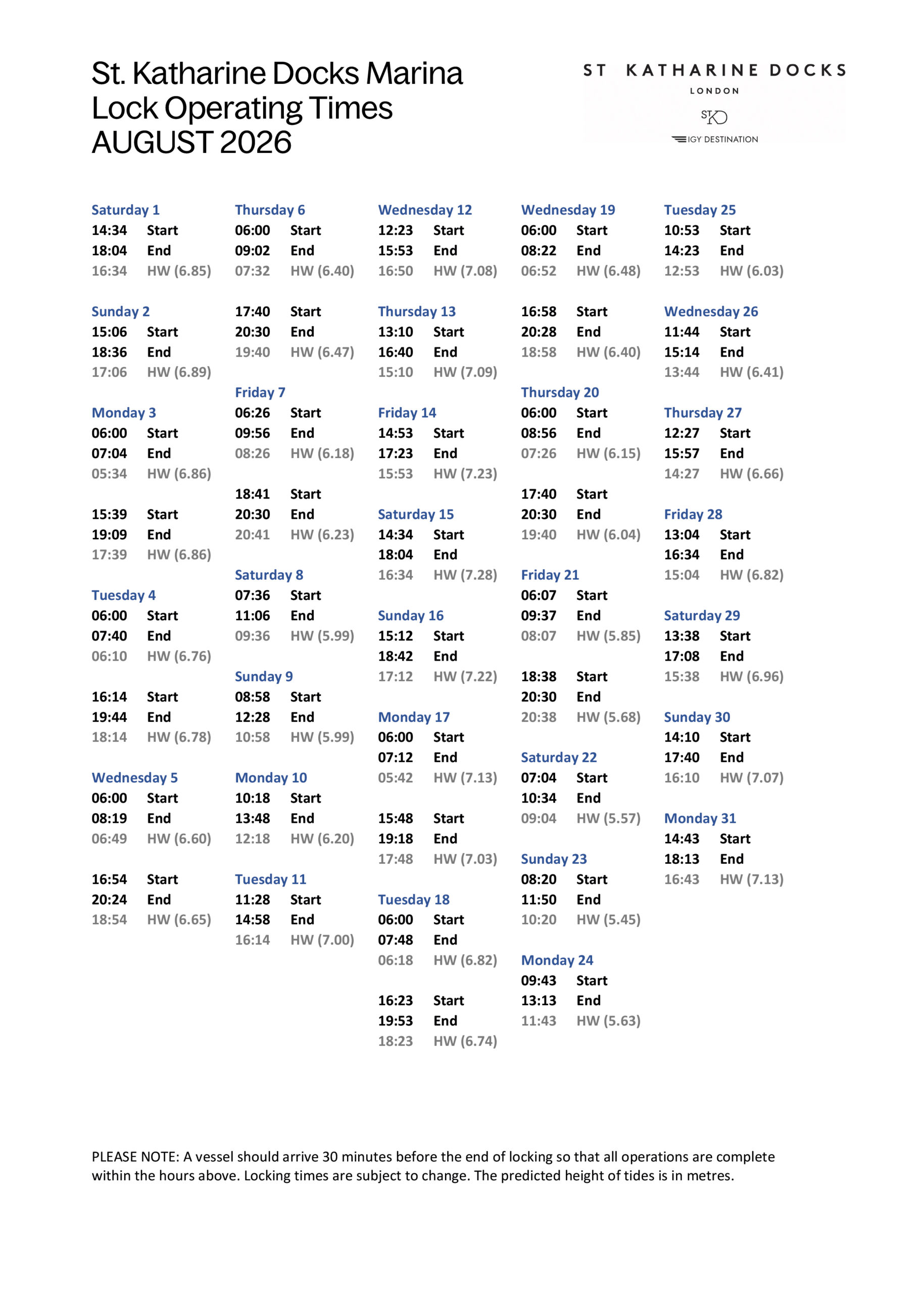 SKD Marina Locking Times August 2026(PDF, 0.49MB)