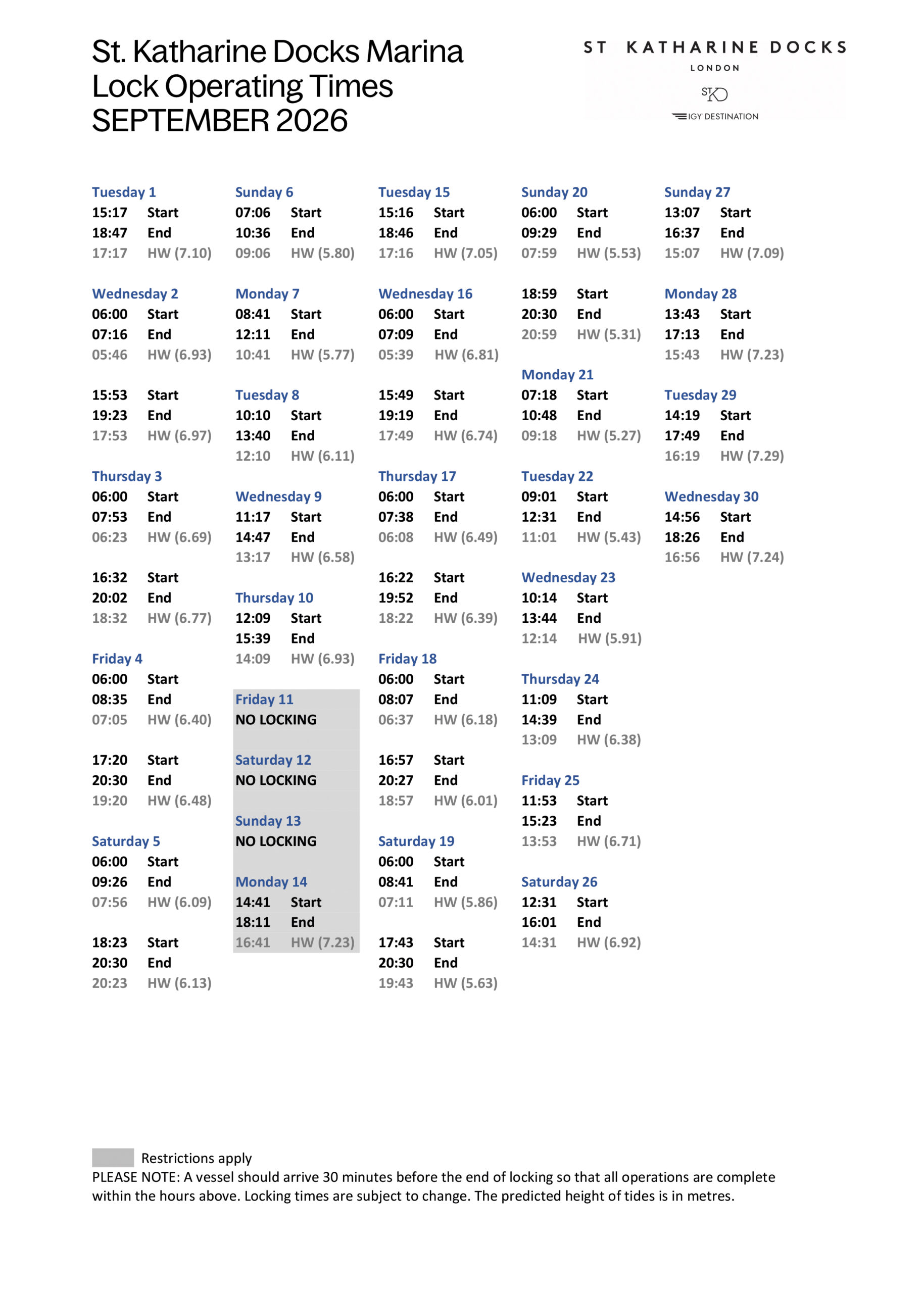 SKD Marina Locking Times September 2026(PDF, 0.49MB)