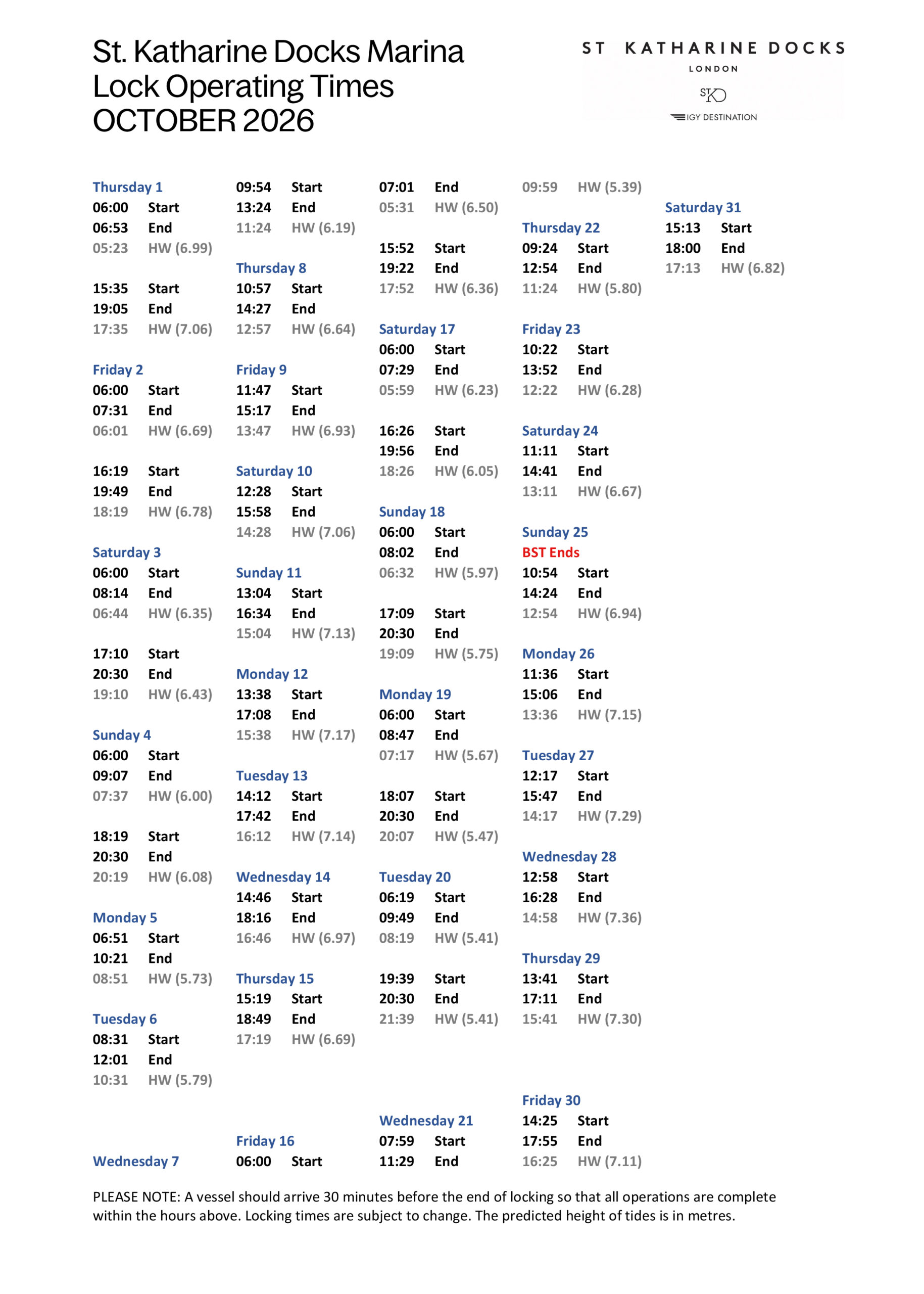 SKD Marina Locking Times October 2026(PDF, 0.49MB)